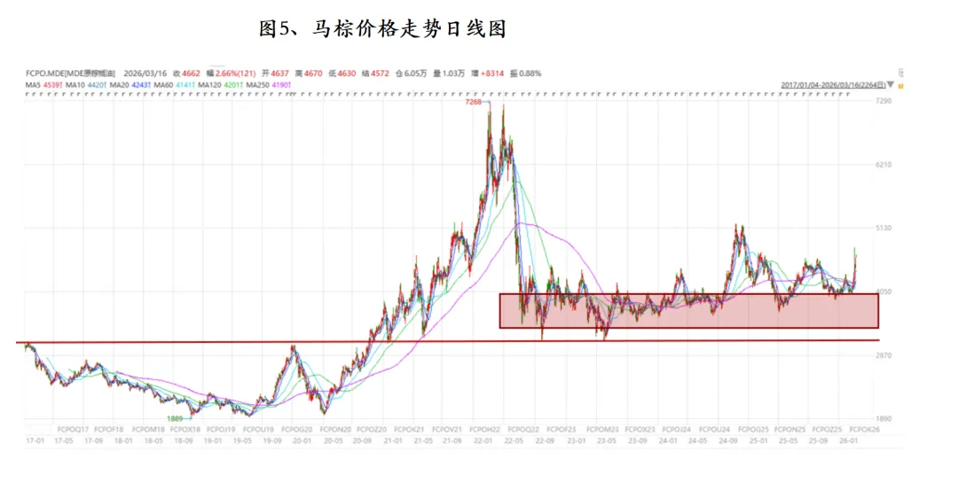 能源属性溢价凸显。美以与伊朗局势导致国际柴油价格因地缘政治冲突大幅上涨,布伦特原油突破每桶100美元。在此背景下,印尼不排除重提B45/B50实施可能性,生物柴油需求的潜在增量将进一步支撑棕榈油价格。