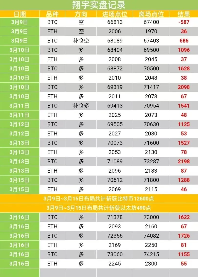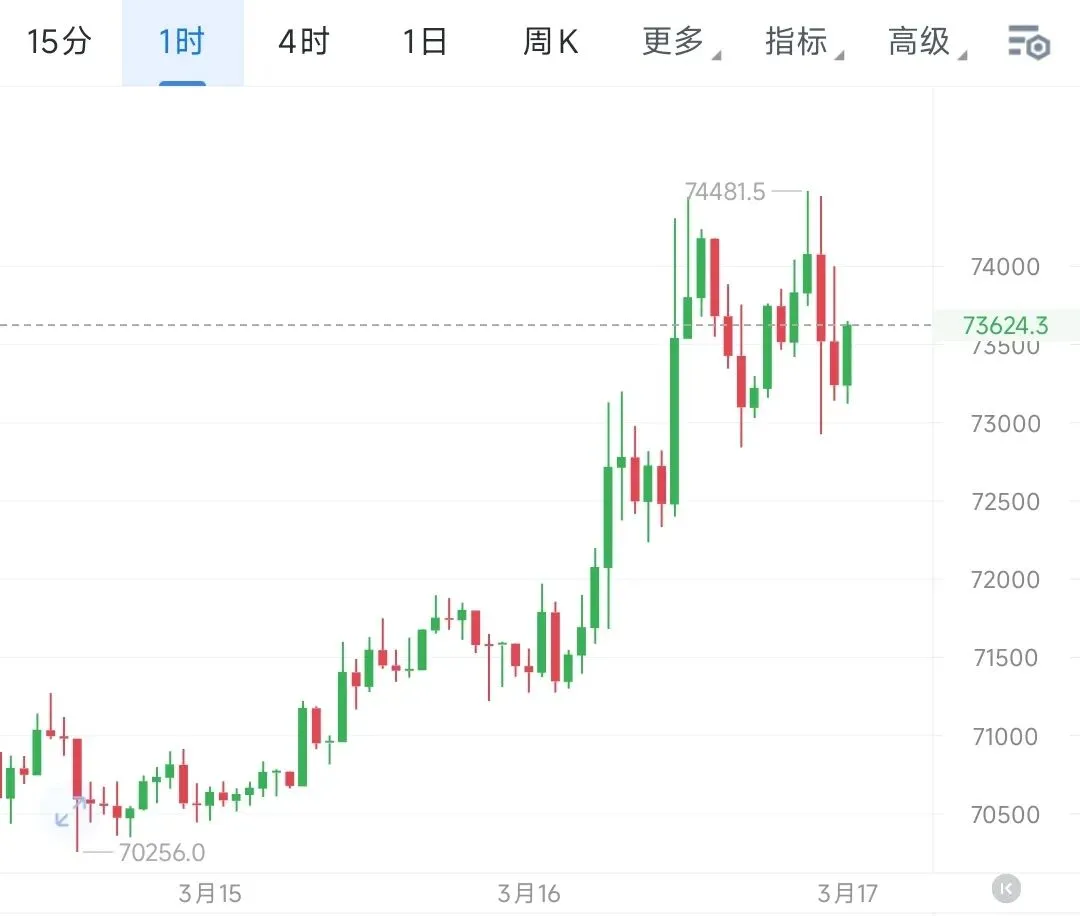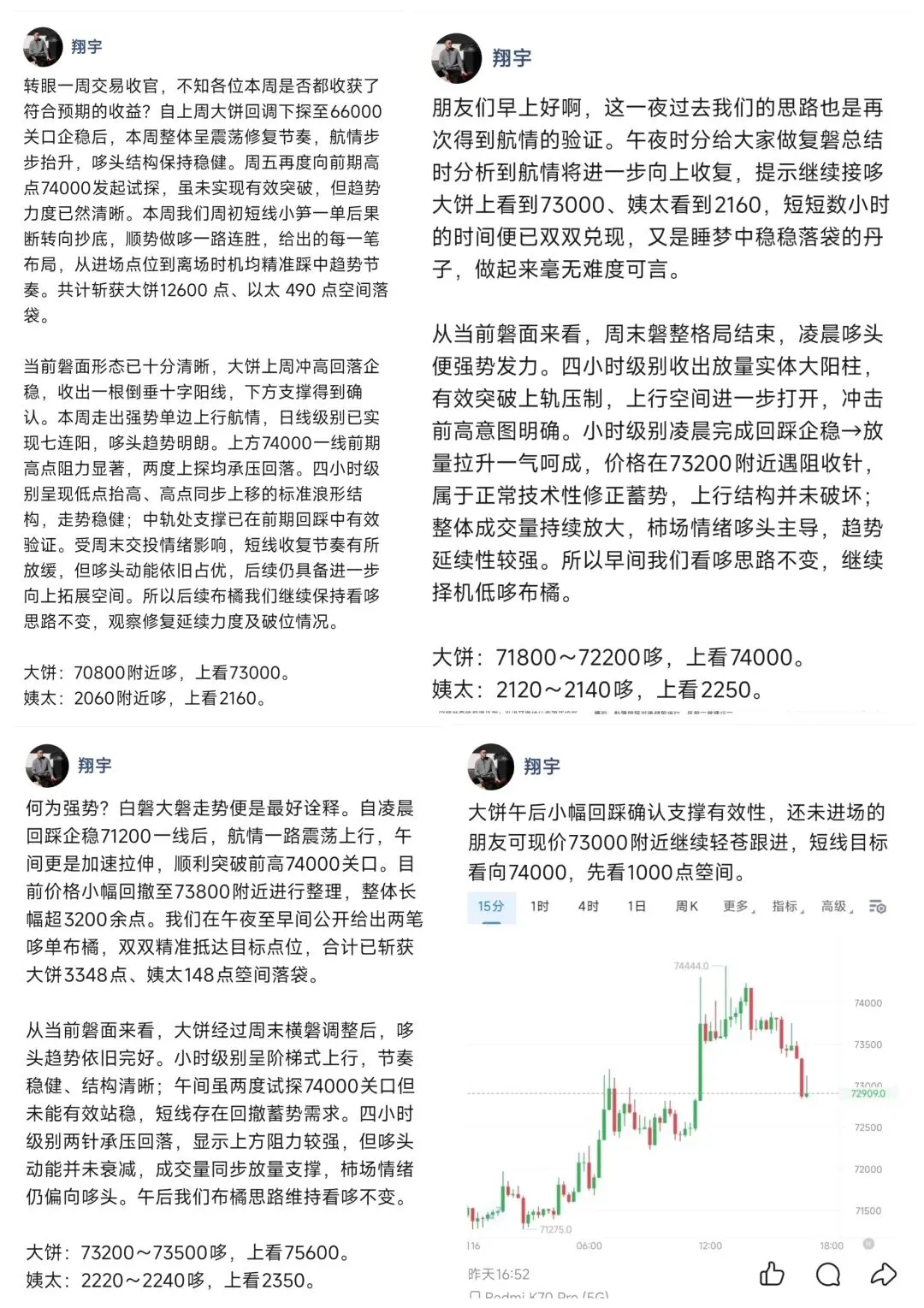 今日大磐航情,应该不会有人再做错吧?自凌晨时段便给出提示:周末震荡蓄势完毕,上行航情即将启动。白磐大饼如期单边走强,突破74000关口后承压回落,回踩72800企稳反弹;晚间再度上攻74000,虽未完全站稳,但哆头强势格局已充分显现。日内我们公开布局三笔哆单,全部顺利止赢落袋,共计斩获大饼4503点、姨太203点箜间。