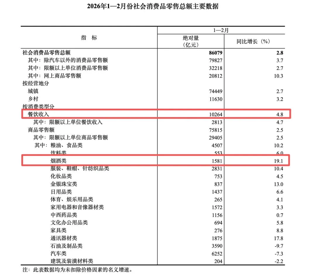 3月16日,国家统计局发布数据显示,1-2月,社会消费品零售总额为86079亿元,同比增长2.8%。餐饮零售总额为10264亿元,同比增长4.8%,去年12月增速为2.2%,环比增速明显加快,也快于2025 年1-2月4.3%的增速。烟酒类为1581亿元,同比更是录得双位数,增长19.1%。2025 年1-2 月,这一增速只有5.5%,明显加快。