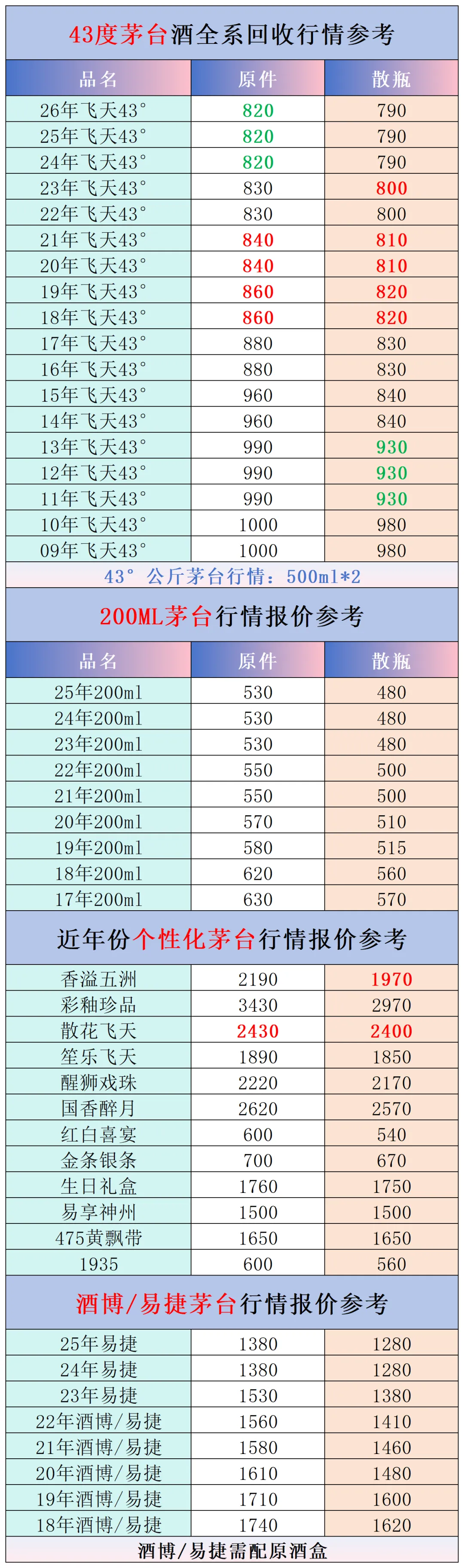 本公众号提供各种名酒回收行情报价,常规茅台、五粮液、洋河、剑南春、国缘等。所有报价根据市场买卖行情总结而来,每天更新最新报价!部分酒水每天涨跌幅较大,无法及时更新请谅解。本报价仅供参考,并非实际成交价格。感谢您的关注!我们会竭尽所能,提供更多更好的服务。