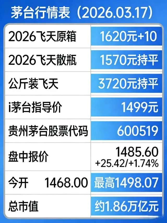 截至3月17日11:30盘中休市,贵州茅台(600519)报1485.60元,较昨日收盘价上涨25.42元,涨幅1.74%;早盘高开1468.00元,最高触及1498.07元,总市值稳守1.86万亿元,成交额超44亿元。近三个交易日股价连续上行,从1420元一线稳步攀升,估值重回20倍以上,资金回流迹象明显,彰显龙头韧性。
