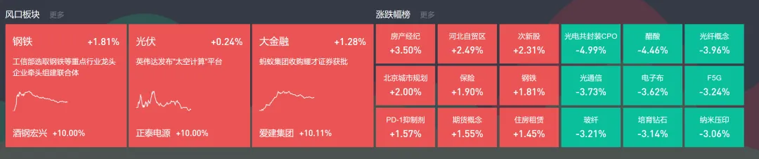 地产涨,保险通常也会跟着好,因为他们持有大量地产项目。今天券商期货也走强,大金融发力,钢铁也起来了。这种时候往往不是好事,通常会出现明显分化。开盘15分钟后,大票领涨小票滞涨,到中午跳水就变成小票领跌了。