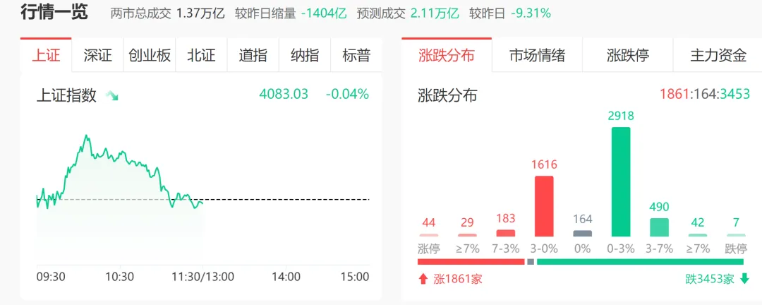 今天盘面冲高回落,1900个票涨,3500个票跌,涨停44个跌停7个。主力资金跑了260亿,昨天跑了480亿。最麻烦的是缩量了,全天只有2.1万亿,少了1400亿。