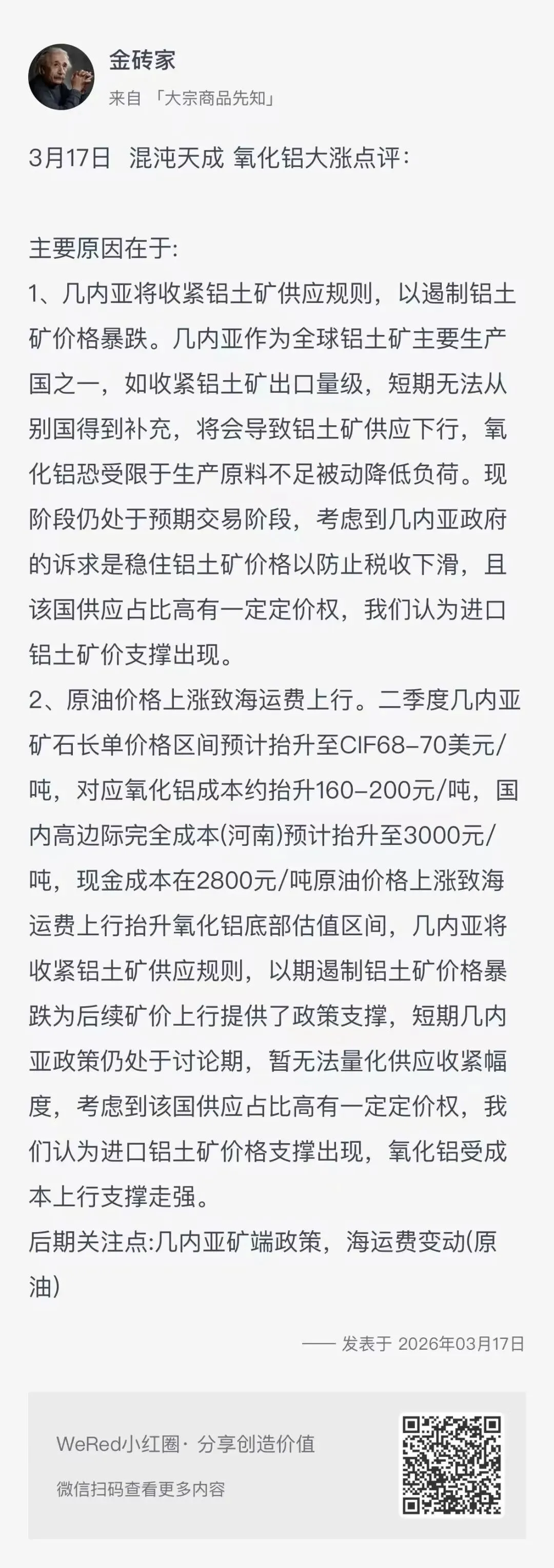 近期有些人看空的原因是:伊朗冲突影响了部分中东电解铝产能,本来给中东供应的氧化铝溢出到国内,然后氧化铝内外套利空间打开,很多贸易商也套了一些。