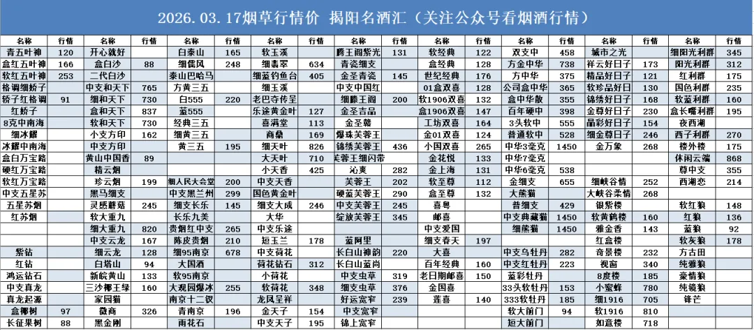 2026年3月17日,茅台等名酒市场行情及回收报价