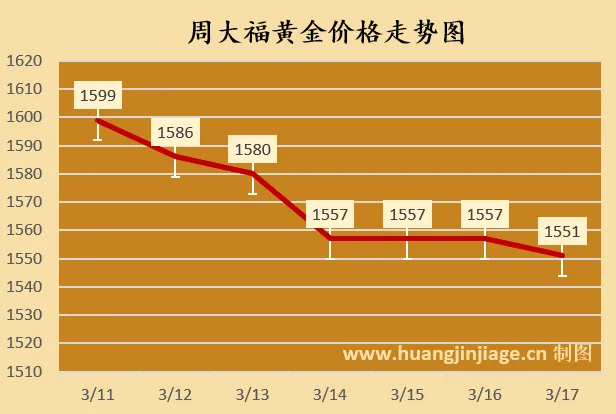 周大福 | 黄金价格 | 1551 | 跌6元 |