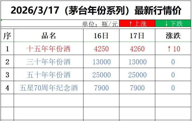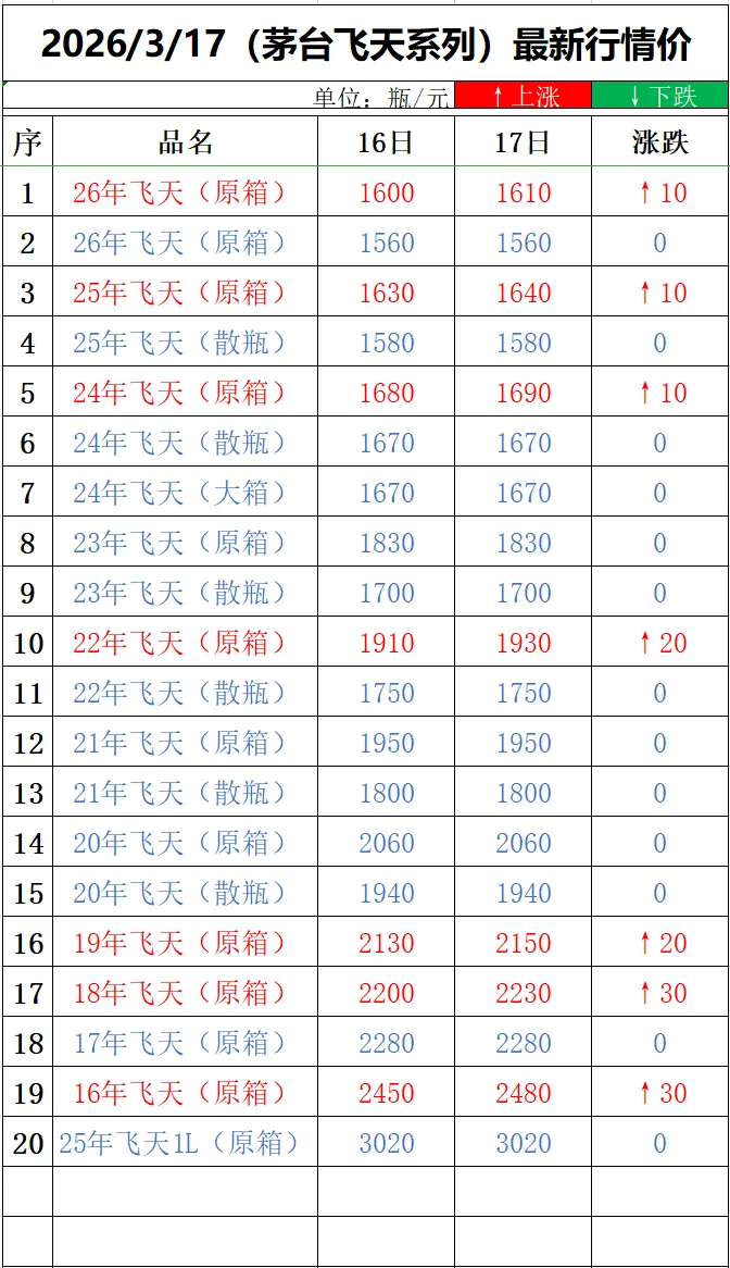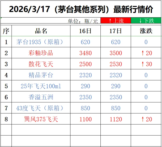 当前位置:首页>行情>3月17日茅台名酒行情价,飞天上涨!