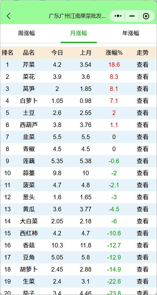 "跌多涨少"是主旋律。 监测的25个品种中,周环比下跌的有15个,占比60%;月环比下跌的更高达17个,占比68%。这反映出进入3月后,随着气温回升,各地蔬菜生长周期缩短,产能恢复明显,市场整体供应趋于宽松。