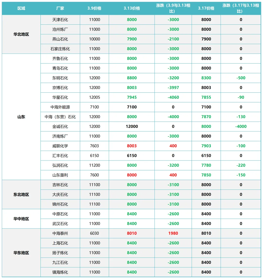- 山东:预计商谈 7900-8400 元 / 吨,震荡整理;3 月 16 日成交放量提供支撑,但地炼报价分歧明显,后期受华东采购、原油走势及套利窗口影响较大,需求不足或有回调,供应减量有望支撑价格。
