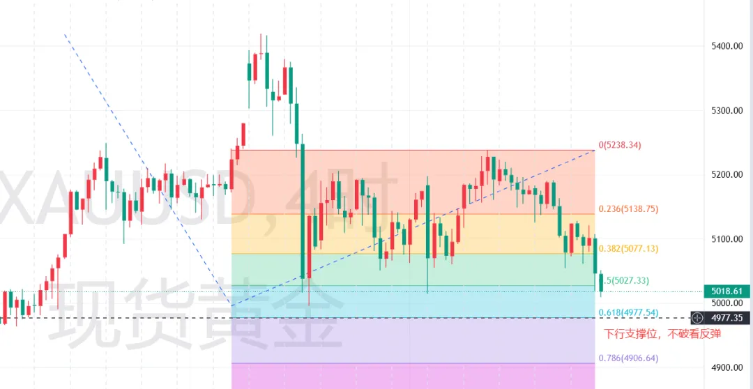 周一开盘前,我的核心思路是建议延续上周的下行趋势,继续看金价震荡走跌。但昨日实际盘面走势并未完全符合预期,欧美盘时段金价两次尝试向下发力,却都未能有效跌破早盘下探的低点,最终全天整体围绕5000美元关口展开震荡整理,多空双方暂时处于胶着状态,没有一方能够占据明显优势。