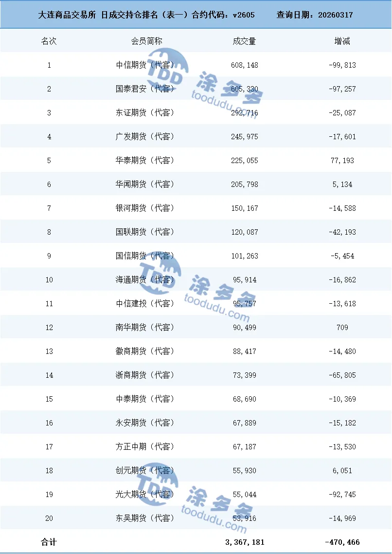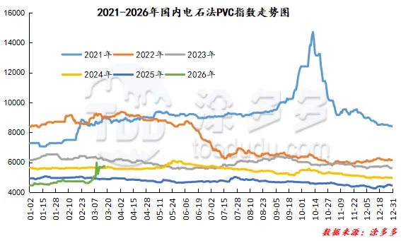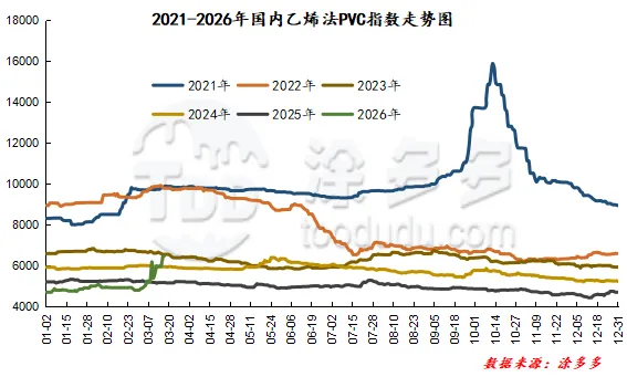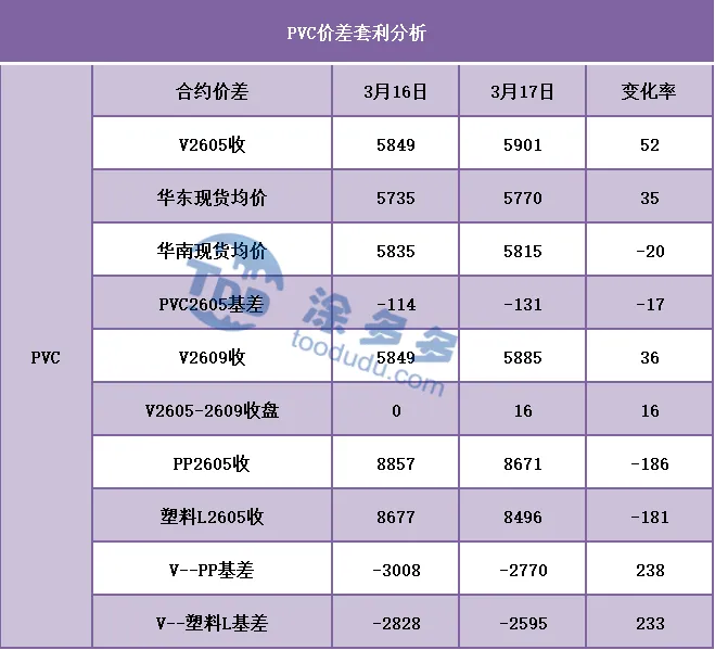 期货方面:PVC2605合约期货盘面期价的运行在周二时段呈现的温和调整的方式,基本在昨日的运行区间范围内微调,虽然波动幅度也在278点位,尚属于宽幅的范畴,但期价的调整似乎进入了第一个瓶颈期。正如我们所料般在5800-6000的区间范围内连续调整,技术层面显示布林带(13、13、2)三轨开口向上,日线级别的KD线以及MACD线继续呈现金叉趋势,周二时段小幅增仓,对比高位持仓近期的仓量减少,部分资金离场观望。我们仍旧维持前期的观点,短期之内期价的调整继续观察5800-6000范围的调整,以及6字头上方区间的高位在突破。现货方面:首先外盘方面,国际油价下跌,因全球正收到信号,显示伊朗正允许一些油轮通过霍尔木兹海峡,而且国际能源署(IEA)署长暗示可能释放更多石油储备以遏制由伊朗战争引发的飙升的油价。自2月28日美国和以色列攻击伊朗以来,布伦特和WTI这两种基准原油价格已上涨近40%。油价进入调整状态后,今日国内多数商品的波动也相对温和,而PVC方面的基本面仍是前期的问题,电石法开工相对稳定且有提升,但乙烯法受原料的影响开工仍不稳定。需求方面未见明显的新意,近期行情价格的大涨令中间商异常活跃,但出厂价格和消费地区价格的倒挂也使得中间商需要更精准的套保把控,大行情中获利的风险增加。整体来看短期之内PVC价格的强势运行趋势仍会延续。 据涂多多数据测算,3月17日国内电石法PVC现货指数为5735.51,跌9.03,幅度0.1579%。乙烯法PVC现货指数为6473.04,涨30.43,幅度0.472%,电石法指数下跌,乙烯法指数上涨,乙烯法-电石法指数价差737.53。来源 | 涂多多产业大数据部