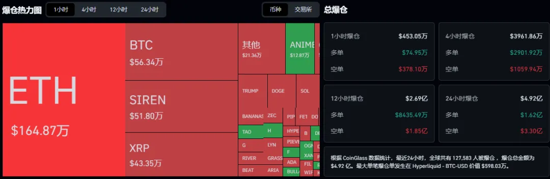 过去24小时全网共有127,583人被被爆仓,爆仓总金额为$4.92亿美元,多单爆仓1.62亿美元,空单爆仓3.30亿美元。📊 主流币表现: