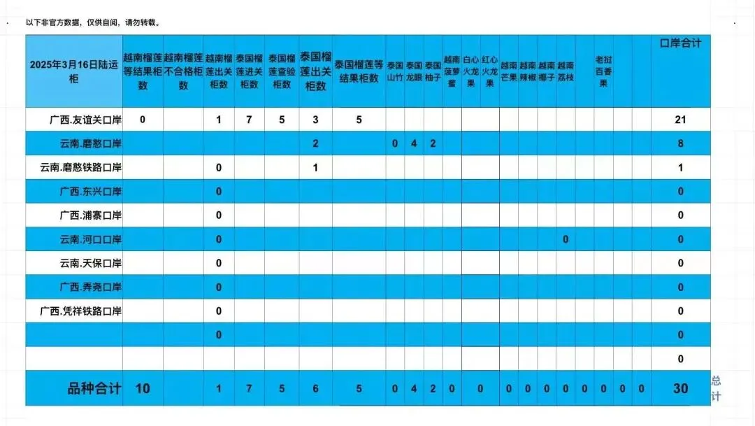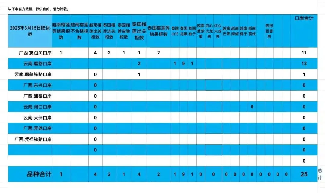 2026/3/17 GZ今天共开16柜,其中泰国6柜,越南8柜,菲律宾2柜,整体市场氛围一般,行情略掉,泰国甲仑好走,越南干尧走速很慢泰国金枕,A6/19.5kg走1250左右,甲仑,A7/17.5kg/走860-880越南干尧,A3/9.5kg走在420-430菲律宾普雅,A3/10kg走在380-400今天整体预计走4-5成左右泰国泰狼/空运/6.8m/猫山王/A5/10KG/1080开/B6/10KG/930开鱼牌/甲仑/A3/9kg/450开 CV/甲仑/A6/17.5kg/900开 越南G63/干尧/A3/9.5kg/450开 荣都/干尧/A3/9.5kg/450开 鸿桂华/干尧/A3/10.5kg/480开云果飞/干尧/A3/10kg/460开福宝/干尧/A3/10.5kg/480开3月15/16日陆运口岸数据越南榴莲总出关数据:17/23柜。泰国榴莲总出关数据:4/6柜。越南榴莲0柜退运,泰国榴莲0柜退运。越南榴莲进关查验无送检直接放行出关0/0柜。仅供参考。‼️