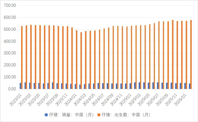 统计局五部联合发布,截止到2025年年底,能繁母猪存栏3961万头,较9月底下跌74万头,下降1.8%,为正常保有量(3900万头)的101.6%;钢联数据显示2月能繁母猪存栏量为环比增加0.0%,同比下跌0.0%,涌益数据显示2月能繁母猪存栏量环比增加0.4%,同比下降0.1%。钢联样本企业调查数据显示,2025年2月仔猪出生量578万头,环比增加0.76%;2月仔猪销量46万头,环比减少9.5%。