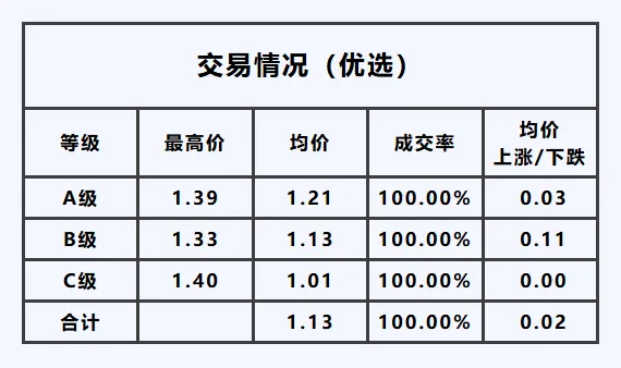 C级——最高价1.45元/枝,均价较昨日,下跌0.06元/枝。