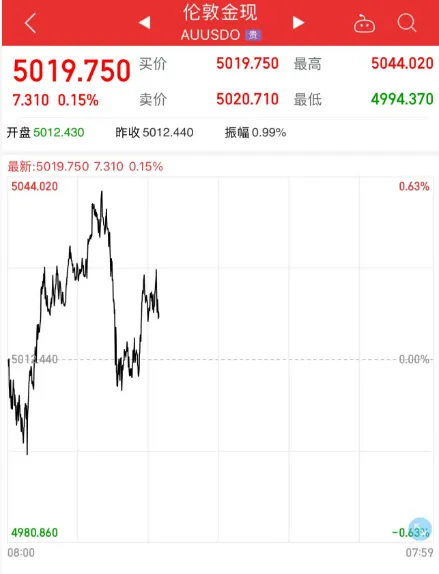 伦敦金现(国际现货):5019 美元 / 盎司,较前一交易日上涨 6.56 美元,涨幅 0.13%