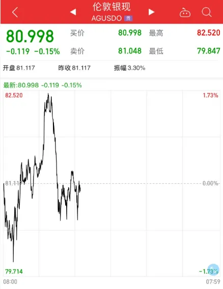 伦敦银现(国际现货):81.005 美元 / 盎司,较前一交易日下跌 0.112 美元,跌幅 0.14%