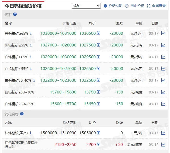 本次钨价核心基准为您提供的上海有色网(SMM)3 月 17 日官方现货报价,同步参考中钨在线、中国钨业协会等平台报价,完整呈现产业链价格分化特征。针对不同平台报价差异说明:中钨在线等贸易平台 3 月 17 日 65% 黑钨精矿挂牌区间 105.0-107.0 万元 / 标吨,与 SMM 报价差异源于含税成交价 / 挂牌价、区域货源、成交活跃度不同,SMM 为国内现货主流结算参考基准,以下以官方截图数据为准。