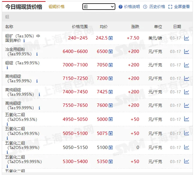 钽锭(Ta≥99.95%,SMM 口径):主流报价 6050~6150 元 / 千克,均价 6100 元 / 千克,单日维持平盘,高位持稳