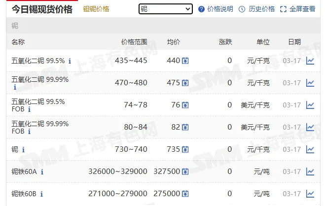 工业级铌锭(≥99.9%):主流报价 620~630 元 / 公斤,维持八年新高,单日无明显涨跌