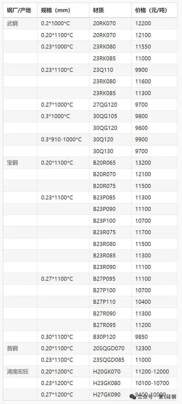 注:格表只展示部分硅钢牌号价格信息,另外本平台提供国内、国外钢厂各种牌号硅钢订购服务,了解更多请进入本站官网。