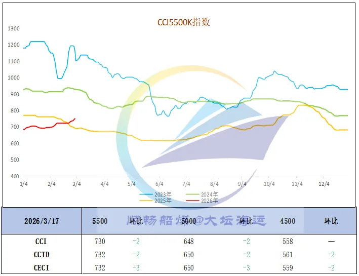 今日市场交投持续火爆,运价在昨日大幅走强的基础上再度跳涨。主要原因:一是煤价经过前期连续下跌,部分煤种已接近长协煤价格水平,继续下行阻力加大,市场企稳预期明显增强;二是进口煤采购成本高企,叠加国际能源形势不确定性增加,电厂为防范后续供应风险,在淡季提前开展资源储备;三是北港库存持续累积,疏港压力不断加大,货源加快向下转移,带动订船需求边际改善。在部分航线运力结构性偏紧以及燃油成本高位运行的情况下,船东报价心态持续坚挺。