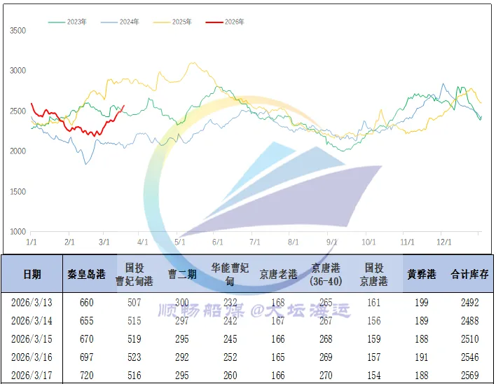 近期,随着产地供应逐步回升,加之集港发运利润有所改善,港口调入量维持高位运行。调出方面,尽管电厂长协煤拉运仍在持续,但随着供暖季临近结束,叠加煤价持续走弱,下游采购普遍持“买涨不买跌”心态,多观望等待更低价位,采购节奏偏谨慎,拉运积极性提升空间有限,港口调出量依旧偏弱,明显低于调入水平,港口库存呈持续累积态势。