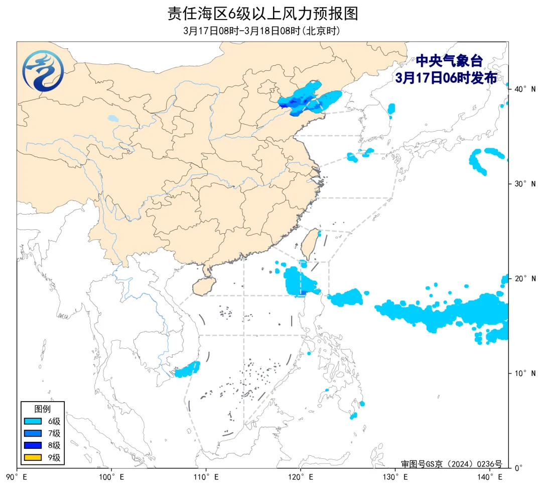 17日08时至18日08时,渤海、渤海海峡将有6~7级、阵风8级的偏北到东北风,黄海北部海域将有5~6级、阵风7级的偏北风,巴士海峡将有5~6级、阵风7级的偏东风。