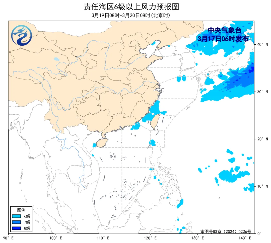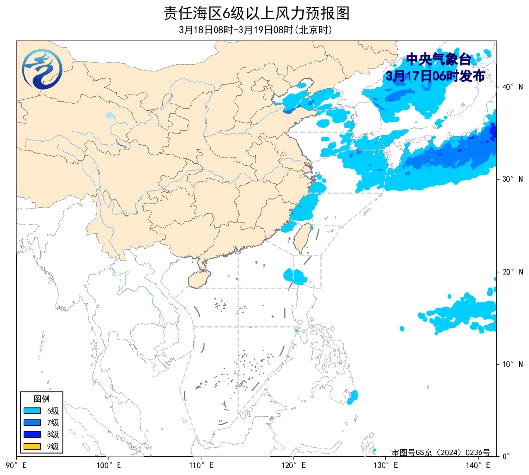 18日08时至19日08时,东海北部海域将有5~6级、阵风7级的西南风到偏西风,渤海、渤海海峡、黄海大部海域将有5~6级、阵风7级的偏北到东北风。