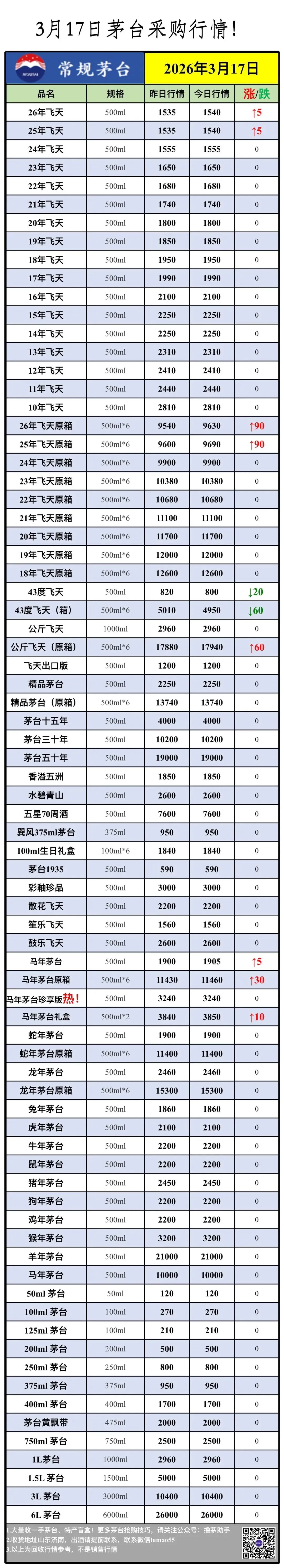 >3月17日 茅台行情,飞天上涨!