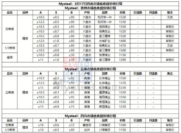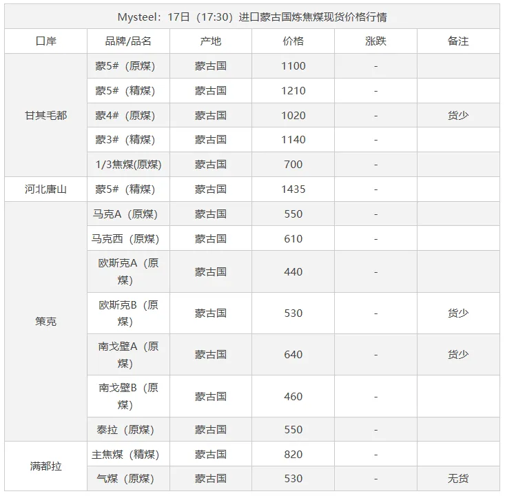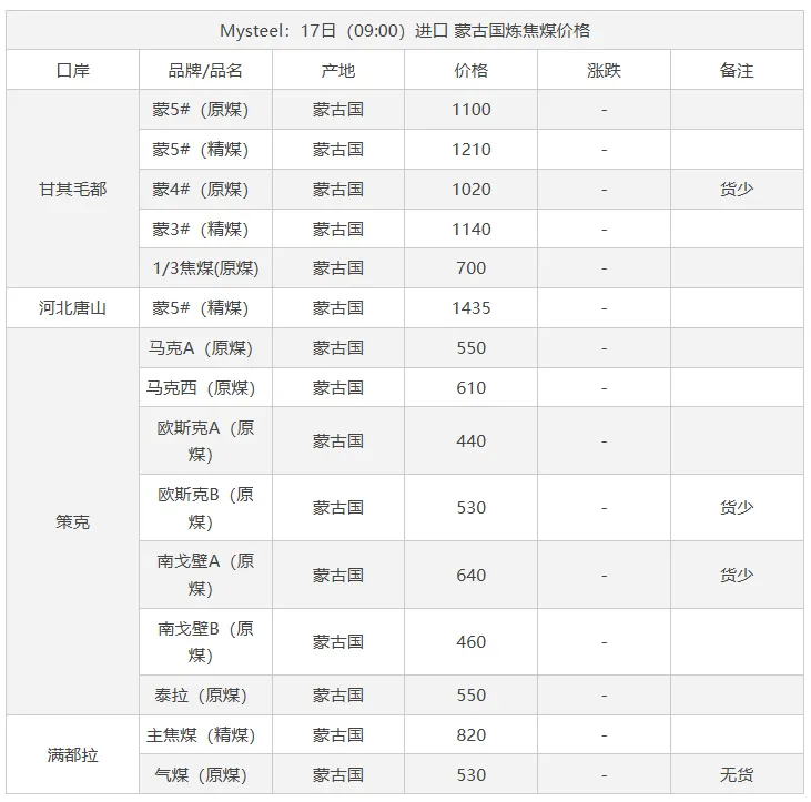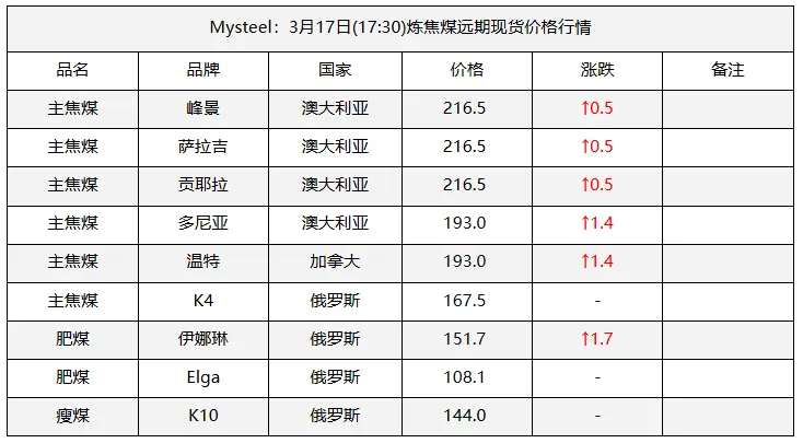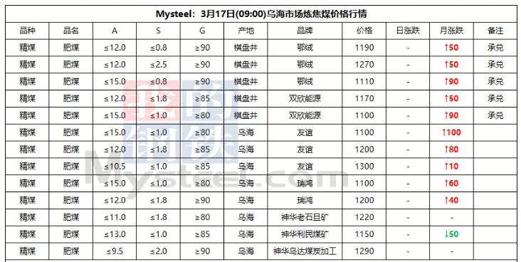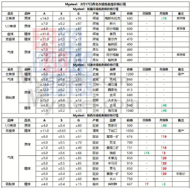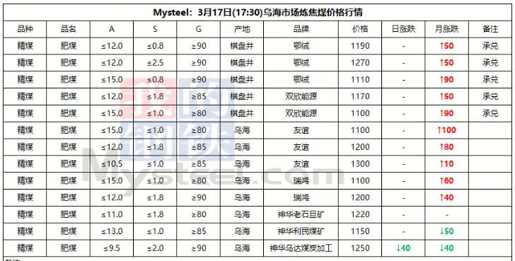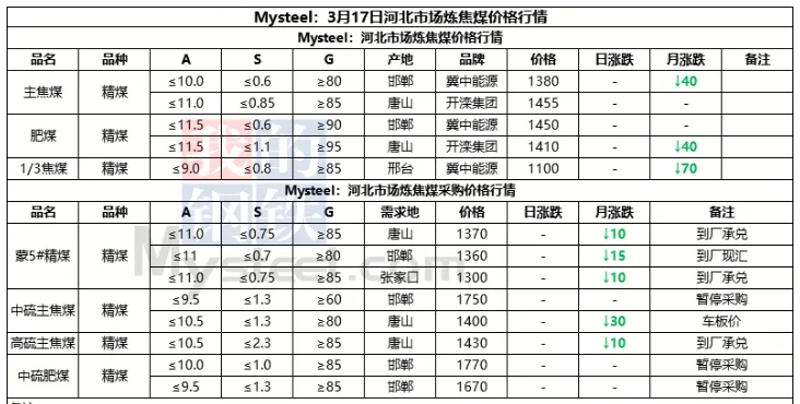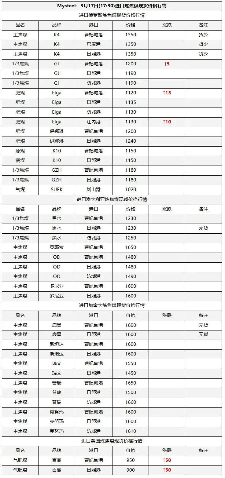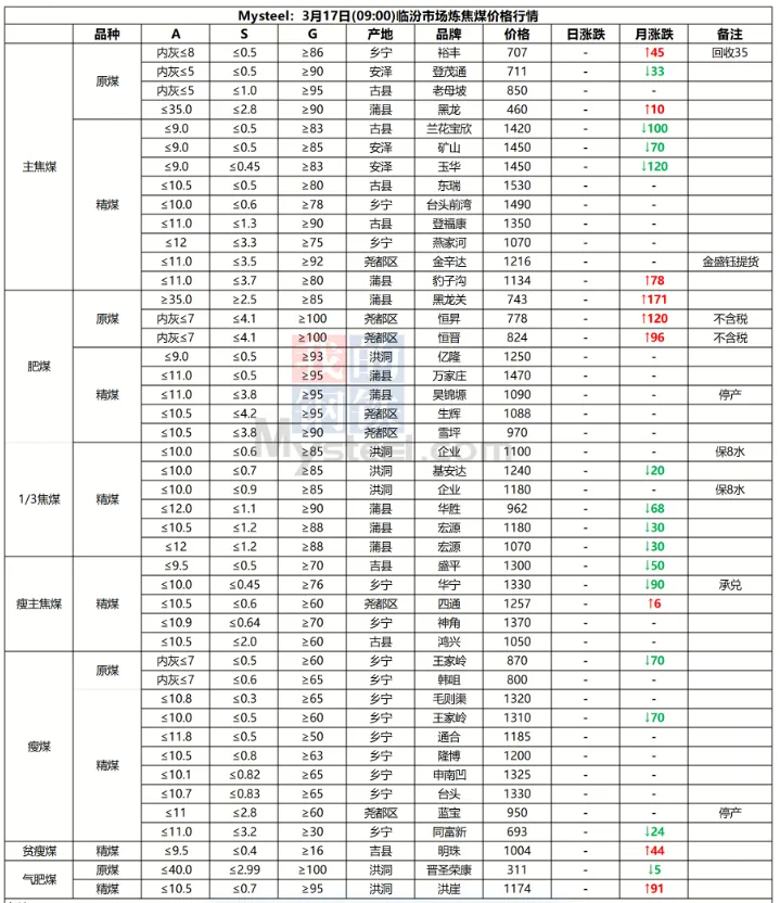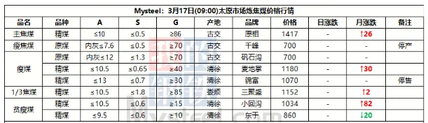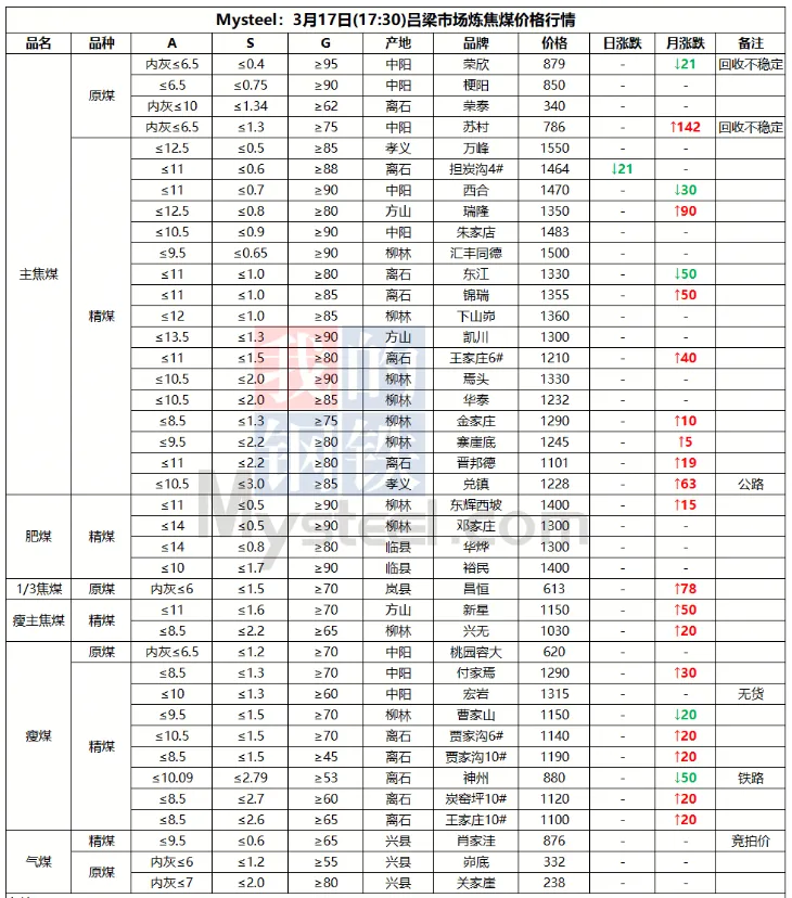 17日吕梁市场炼焦煤偏强运行,市场采销情绪积极,多数煤种出厂价上涨。产地端煤矿库存低位,新成交订单较多,出厂价上涨10-70元/吨,线上成交涨多跌少,成交价有所上涨。中间洗煤及贸易企业采购量也有所加大,活跃度提高。随着原料煤价格企稳反弹,焦钢企业也加大采购量,进行了一轮小补库。下游钢厂陆续复产,铁水或有回升可能,对炼焦煤有一定支撑。焦炭在进行第一轮降价后,钢厂暂无继续提降的计划,焦炭提涨仍需原料煤的支撑,原料煤上涨幅度较小,焦炭提涨难度仍然较大,短期内炼焦煤稳中偏强运行,焦炭持稳运行。