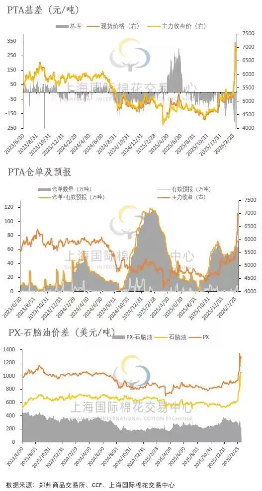 4.近期进口纱市场外盘方面,国际棉价和印度棉价持续上涨,或将进一步推高其出口报价;巴基斯坦亦因优质棉供应偏紧、叠加国际局势影响导致棉花进口暂停,本地棉价持续抬升,预计本周仍有上行空间。当前市场贸易商订货心态谨慎,在外盘价格偏高背景下以观望为主。内盘方面,现货报价基本持稳,港口库存持续消化,巴纱现货价格较上周有所回落,与订货价格价差偏小,订货空间有所缩减。当前国际棉价上涨,郑棉价格受传导可能性较大,后续持续关注国际棉价走向和去库消化情况。