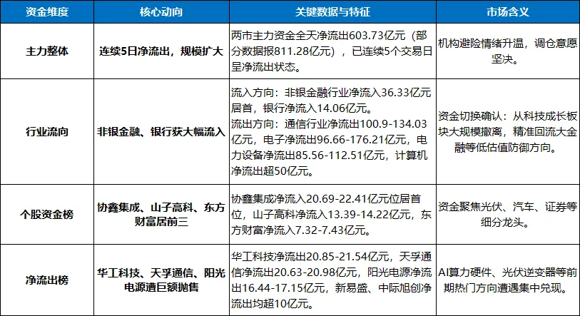 今日资金面呈现清晰的“避险驱动”特征,主力资金从科技成长板块大幅撤离,涌入大金融等防御性方向。