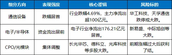 2.科技板块获利了结压力集中释放:通信、电子、半导体等方向连续上涨后积累了大量获利盘,在市场情绪转弱时遭遇集中兑现。华工科技、天孚通信等AI算力龙头遭抛售超20亿元,显示资金出逃意愿坚决。