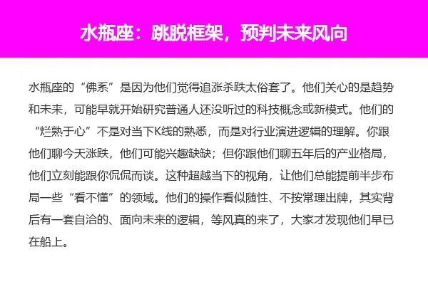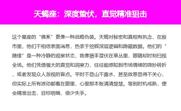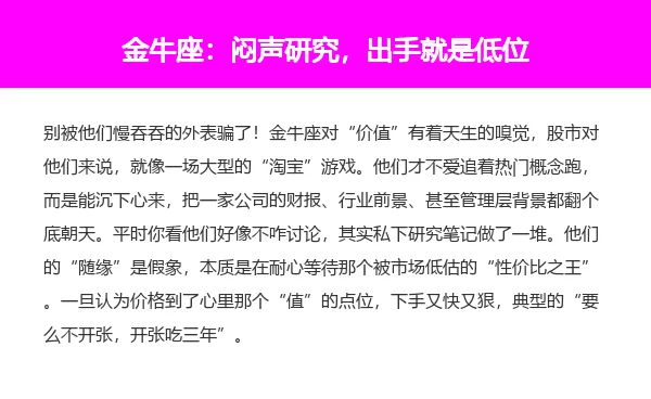 哎,你说这事儿怪不怪,平时聊起股票基金,总有几个朋友摆摆手,一脸“随缘吧,涨跌都是命”的佛系表情。可你真跟他们深聊下去,好家伙,大盘走势、板块轮动、技术指标,人家门儿清,心里跟明镜似的。这种“表面躺平,内心门清”的反差感,在星座圈里尤其明显。今天咱就唠唠,哪三大星座最擅长玩这套“低调的华丽”,看似不争不抢,其实早就把行情嚼得稀烂,就等机会下手了。