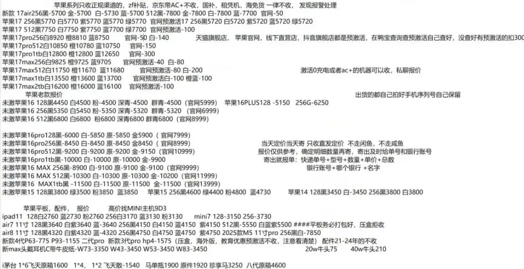 ![]() ![]() 17系列 仅激活 10天内 0充参考行清 17 256 混色5050 17pro256白8100橙8100蓝8100 17pro512白9950橙9900蓝9900 17promax256白9100橙9050蓝8900 17promax512白10900橙10800蓝10800 |