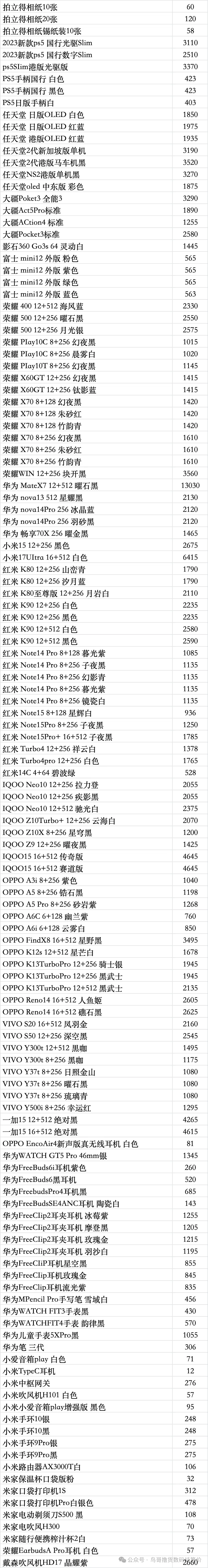 任天堂游戏机: 新款二代NS2港版标配机:3270 新款二代NS2港版马车机:3520,没游戏码:3270(注意下单要看有没有游戏码的 要不然就是便宜的) 新款二代NS2新加坡版 台版 单机:3190,就是没有游戏的 新款二代NS2韩版 欧版 美版 单机:3160,就是没有游戏的 新款二代NS2新加坡版同捆:3480,没游戏码:3170 NS2港版宝可梦同捆:3600 OLED屏 日版白-25年生产日期1850,非25年-30 彩色-1975 OLED屏 港版白-1815 彩色-1935 OLED屏 国行白-1640 彩色-1640 OLED屏 朱紫港版-1940 日版-1940 OLED屏 喷射港版-1940 日版-1940 健身环国行-145 海外版-340 LITE日版 港版 蓝:1045,黑粉1045,绿黄1045 注意区分,这些就不是oled屏的 价格以下(续航版) NS续航国彩-1430 黑-1310,拆封-50 NS续航日彩-1550 黑-1470 长款-30 索尼PS5游戏机 (PS5都要留好纸箱带来,以免破坏品相) 2024新款:PS5 PRO日数:4840 2024新款:PS5 PRO港数:5370 2025新款:PS5 PRO国数:4910 2023新款ps5 日版光驱Slim:3300 2023新款ps5 日版数字Slim:2770 2023新款ps5 国行光驱Slim:老款:3110,新款3130 2023新款ps5 国行数字Slim:2510 2023新款ps5 港版光驱Slim:3370 2023新款ps5 港版数字Slim:2770 PS5国行手柄:白420,其他420,外版-20 只收跨境 PSP串流机:1345白,1345黑 PS5单国光驱:575,外版525 ROG XBOX : OLED SteamDeck掌机掌上游戏机 512G 美:4060,日港:4060 OLED SteamDeck掌机掌上游戏机 1TB 美:4710,日港:4710 大疆3标准:,全能: 大疆Action4标准:,全能: 大疆ACT5 Pro标准:,全能: 大疆action5pro畅拍: 大疆AC6标准: 大疆AC6畅拍: 大疆NEO标配:,全能: 大疆OM7P:,om7: 大疆 mic1拖1:,1拖2: o4图传: 拍立得MINI12影像花室套装:,外版,一次成像礼盒装 拍立得SE国行:,白色: 拍立得相纸20张:120,10张:60 拍立得锡纸装10张:58 任天堂 手柄 NS左右手柄:370 NS2左右手柄:420 NS2 PRO 黑柄:420 PRO国黑柄:310,外版280只收跨境 PRO乱斗柄:330只收跨境 PRO王泪柄:330只收跨境 PRO喷射柄:330只收跨境 PRO异度柄:330只收跨境 3月16 行情参考 大疆pk3标准2580 大疆pk3全能3290 大疆ac4标准1255 大疆ac5标准1890 大疆ac5畅拍2410 大疆ac6标准2790 大疆ac6畅拍3250 大疆nano 64 :1720 大疆nano128:2020 大疆o4pro图传1460 (26年一月份的不要) mini一拖二 455 云台8 单机 490 云台8 标准 660 【大疆系列只收待更新状态的机器 后封/在保代卖或扣款】 影石acepro一代1445 影石go3s 64 黑白1430 影石go3s 128 黑白1630 影石acepro2单电黑2260 影石acepro2单电白2315 影石acepro2双电黑2310 影石acepro2玩拍套装3430 影石x5标准黑2760 影石x5全能3300 影石go ultra黑2160白2160 影石go ultra人气套装2420 影石aceproPro2 街拍黑 275银 285 影石128内存卡220 影石256内存卡380 影石512内存卡640 遮光罩80 华为手表目前行情参考 华为 Watch FiT4 黑 570 白 565 绿 575 紫 565 银 590 华为 Watch FIT4 pro 黑 1135 蓝 1095 绿 1175 华为 WATCH FIT 3 黑 430 灰 505 月光白 425 原野绿 455 粉 435 薄荷绿 445 蓝 435 珍珠白 495 华为 WATCH FIT 2 活力款 黑色 320 粉 320 Watch D2 黑 2895 白 2825 蓝 2825 药房版 2615 Watch buds 黑 1135 卡其色 1245 GT4 41m 白 765 黑 695 GT4 46m 黑 825 Watch 5 46m 黑 1820 紫 2165 棕 2270 蓝 1875 钛空银 2545 Watch 5 42m 黑 1685 白 1820 杏 2325 绿 1715 金 2355 非凡 2 黑 4945 蓝 5945 非凡手表 黑 3195 华为新款 WATCH GT6 系列 GT6 pro 黑 1825 棕 2135 钢 2535 GT6 46m 黑 1100 灰色 1265 绿色 1400 GT6 41m 黑 950 棕色 1400 白色 1210 紫色 1025 蓝 985 华为新款 WATCH GT5 系列 GT5 46 黑 1045 蓝 930 棕 875 灰 905 GT5 41 黑 885 蓝 815 白 855 青 835 棕 785 GT5pro 黑 1145 陶瓷 2045 钛钢色 1345 冰川白 1015 华为儿童手表系列 儿童 4pro 蓝 495 粉 500 儿童 5pro 蓝 740 粉 725 绿 725 紫 740 儿童 5X 蓝 695 粉 720 儿童 5Xpro 黑 1055 紫 1110 儿童 5 绿 370 紫 375 蓝 415 活力蓝 345 红 330 儿童 5 星耀 粉 425 蓝 425 荣耀,华为手环 荣耀手环 9 标准黑 93 蓝 105 紫 100 荣耀手环 9NFC 黑 120 蓝 120 紫 120 荣耀手环 10 标准黑 137 绿 137 灰 137 蓝 137 荣耀手环 10NFC 黑 155 灰 155 绿 155 蓝 150 华为手环系列 华为手环 8 标准黑 105 粉 108 华为手环 8NFC 黑 108 华为手环 9 黑 160 白 145 粉 143 黄 140 蓝 140 华为手环 9nfc 版 黑 165 白 150 粉 150 蓝 150 黄 148 华为手环 10 标准 黑 165 粉 168 华为手环 10 铝合金款 黑 170 白 173 蓝 170 紫 170 向新绿 165 原野绿 160 灰 165 华为手环 10NFC 黑 195 白 200 蓝 197 紫 200 绿 197 华为手环 11 华为手环 11pro NFC 版 B7 黑 675 灰 685 华为耳机系列 华为 Free Arc 绿 400 灰 420 黑 420 白 390 华为 FreeBuds 7i 白 338 灰 333 粉 338 华为 freebuds6i 耳机 白 260 黑 268 紫 257 华为耳机 Free clip2 黑 1205 白 1195 蓝 1205 金 1215 紫 1255 华为耳机 Free clip 黑色 855 暖星云 870 紫 835 玫瑰金 845 华为耳机 FreeBuds 5i 黑 203 白 220 蓝 218 华为 FreeBuds se2 耳机 白 70 蓝 73 黑 73 紫 73 华为 FreeBuds se3 黑 98 金 98 白 98 华为 FreeBuds Se4 白 140 黑 140 FreeBuds 6 白 515 黑 520 紫 520 金 495 FreeBuds 4e 2024 款 白 290 银 290 FreeBuds pro5 白 1095 银 1115 金 1105 蓝 1115 FreeBuds pro4 黑 695 绿 695 白 695 华为 CD56 pro 笔 453 华为 CD57 黑 245 白 265 华为 CD54S 三代笔 302 华为 三代笔充电器 79 Wifi5 黑 175 白 175 青 173 WiFi3 pro 270 AX3 125 AX6 new 250 AX3 pro new 197 AX3 pro WiFi7 187 BE3pro 千兆版 180 BE3pro 疾风版 170 BE7pro 405 AX2pro 103 荣耀手表 荣耀手表 4pro 黑 695 棕 745 绿 745 荣耀手表 5pro 蓝牙版黑 1105 灰 1085 荣耀手表 5pro 插卡版黑 1195 灰 1195 荣耀手表 5Ultra 黑 1225 |