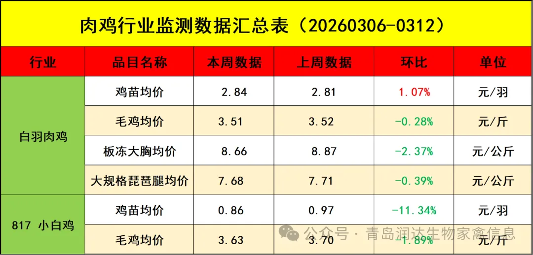 本周白羽肉鸡产品综合售价均下跌,其中板冻大胸周度均价8.66元/公斤,与上周均价相比,下跌0.21元/公斤,跌幅2.37%;大规格琵琶腿周度均价7.68元/公斤,与上周均价相比,下跌0.03元/公斤,跌幅0.39%。