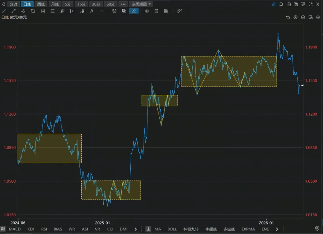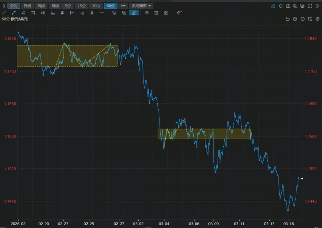 - 价格已从高点 1.1900 附近跌至 1.1550 附近
