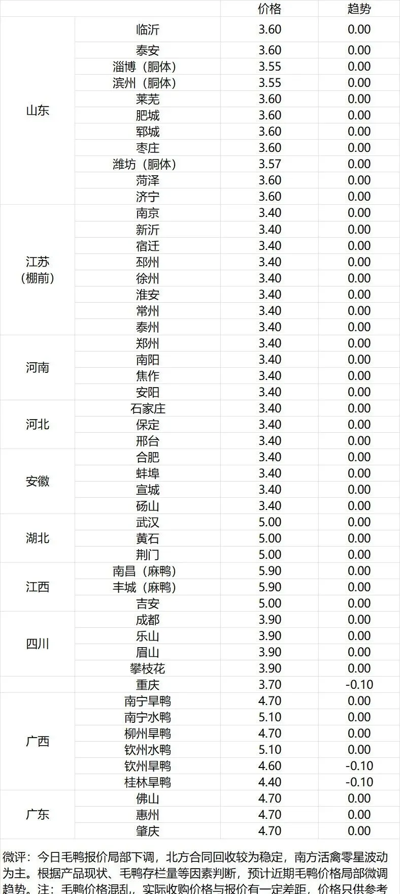 微评:鸭苗报价稳定。(注:南方只报当天价格)苗量少,计划紧张,养殖端成本高企,合同发放量控制,鸭苗报价暂稳。根据产品、养殖成本及鸭苗现状分析,预计近期鸭苗价格呈震荡调整趋势。种蛋报价稳定。温馨提示:该价格为主流厂家报价,实际销售价格以成交价格为准,价格仅供参考。