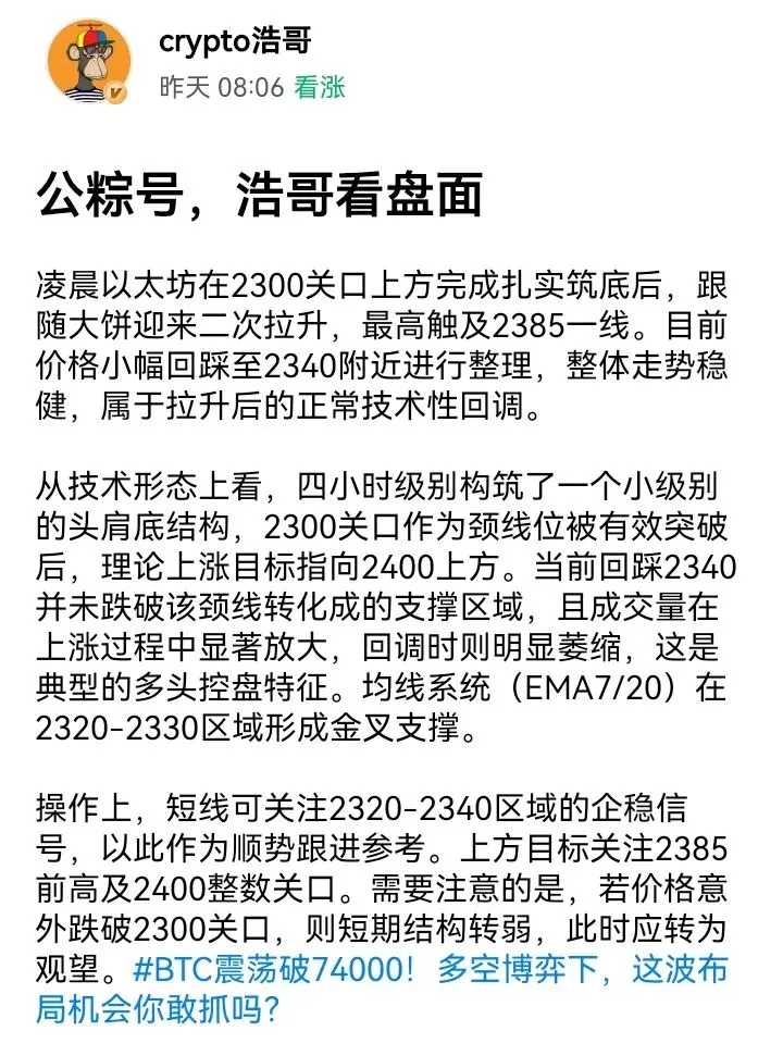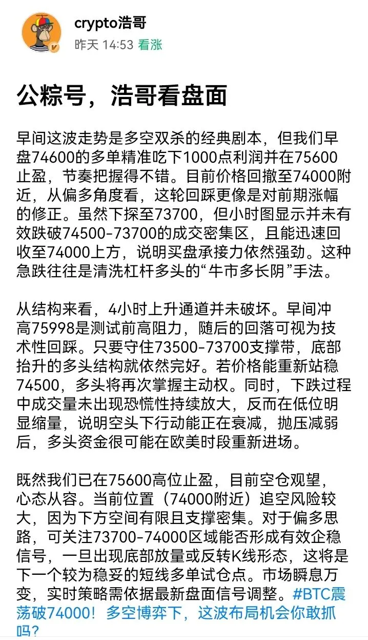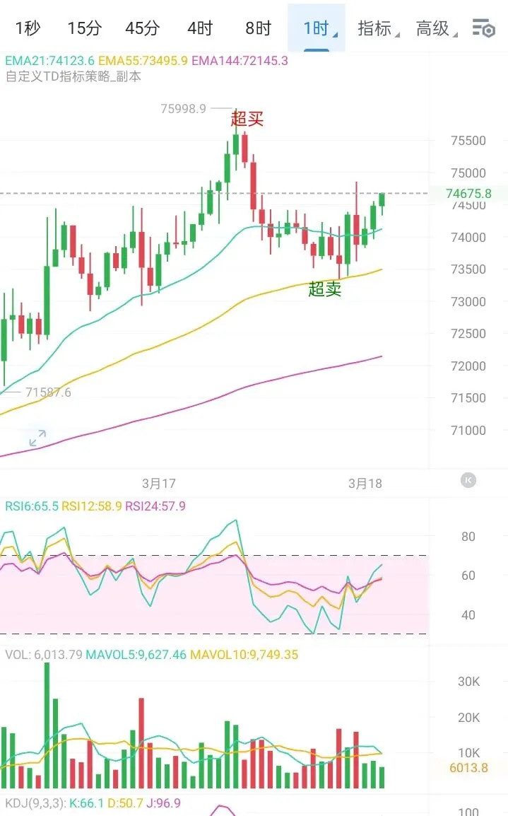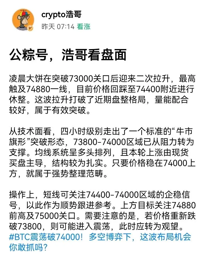 回顾昨晚行情,大饼的走势堪称教科书式的“震荡攀升”。随着美股开盘,市场情绪得到提振,价格小幅上探至74100点。然而,随后的快速回落至73200附近,并未引发恐慌性抛盘,反而迅速企稳,这充分显示出下方买盘支撑的强劲。