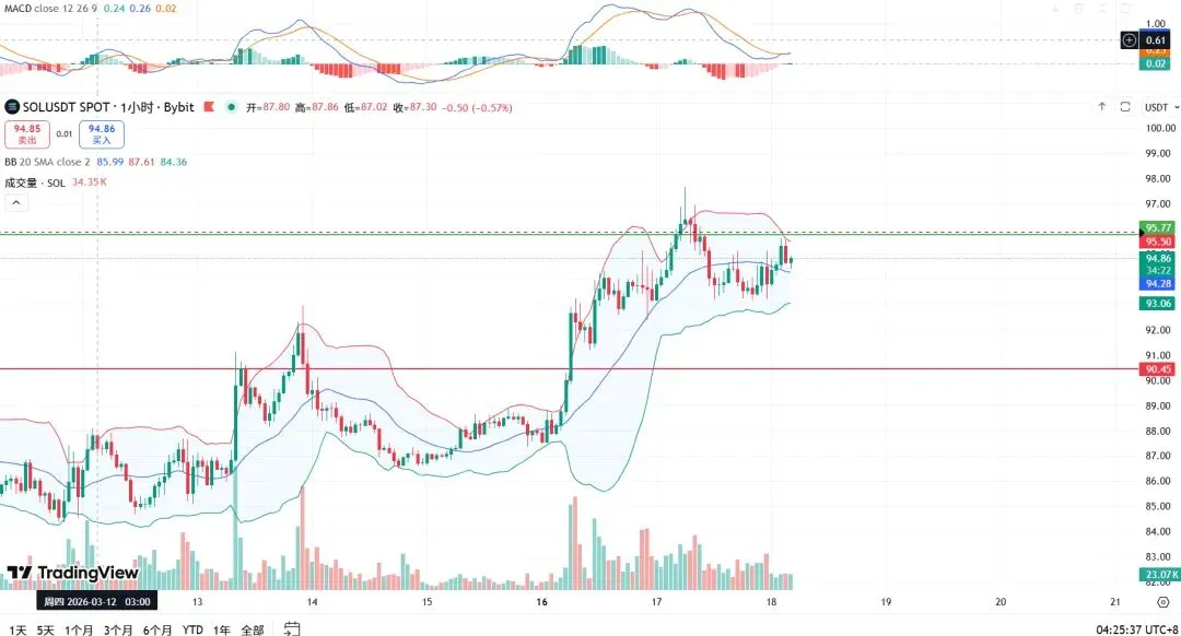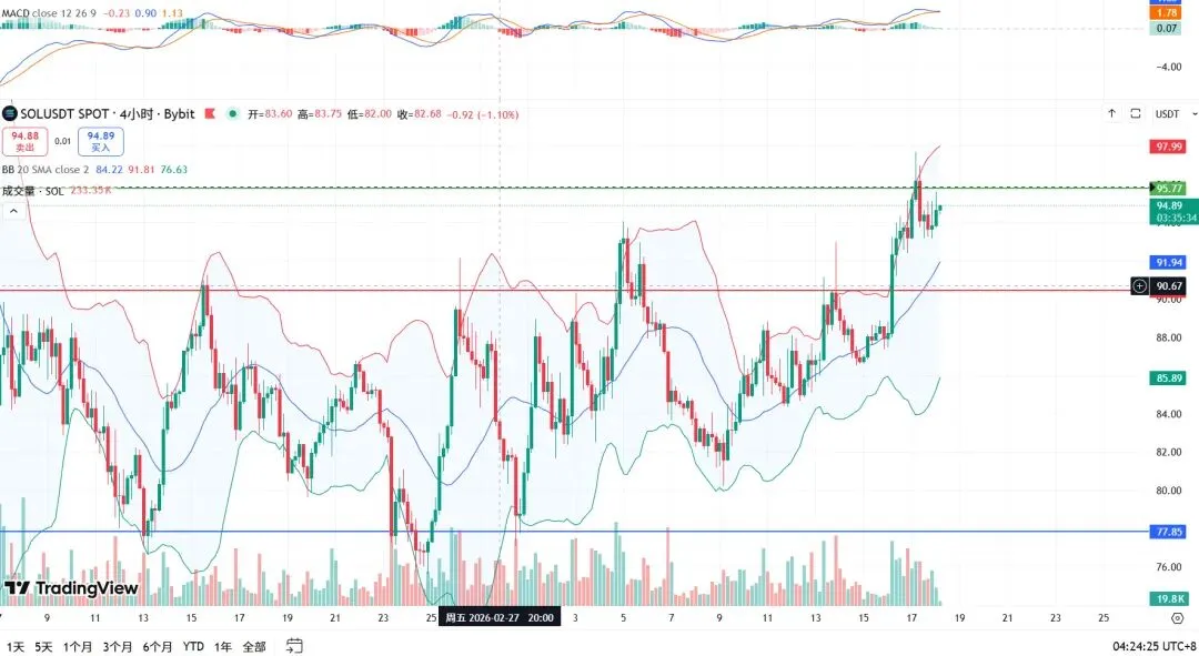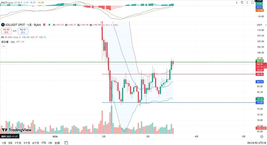 很明显,日线级别已经打破了原先在90-77USDT之间的震荡,开启一定量的上涨📈。但是从成交量和MACD来看,这个波次的上涨动能仍然有一点缺乏,有一定回撤回踩的可能去收集更多的筹码,然后再继续往上方看。