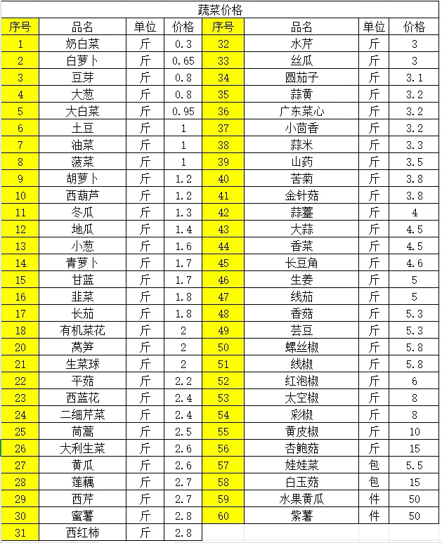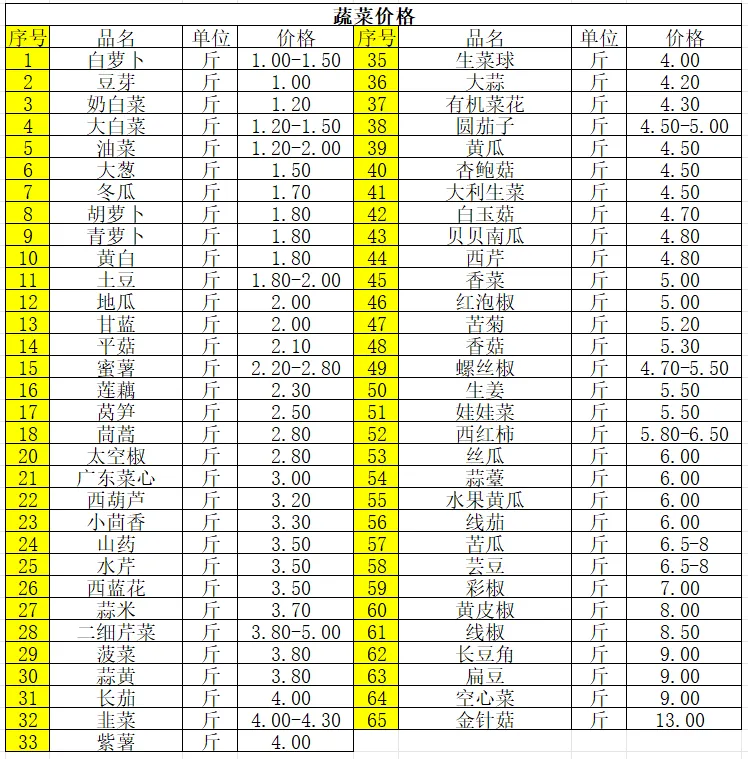 1、蔬菜价格