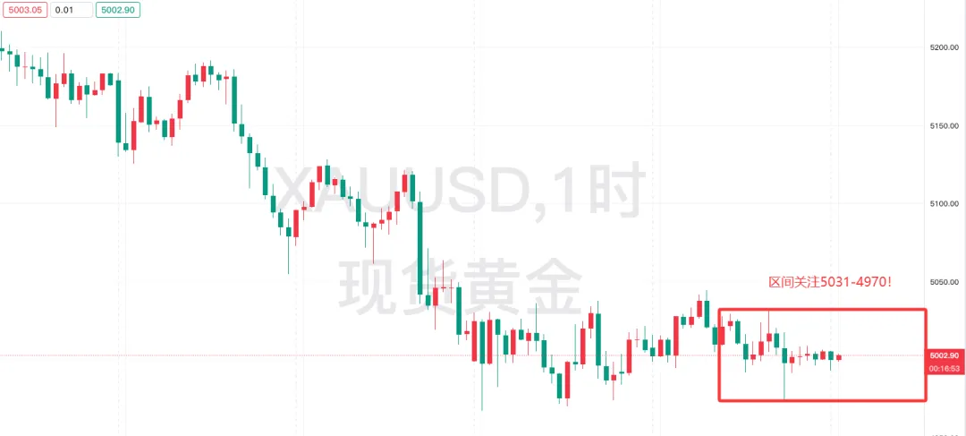 通俗来讲,当前盘面只有两种大概率走向:要么早间快速下穿支撑,打开下行空间;要么横盘过后物极必反,午后迎来持续性反弹。横盘越久,爆发力越强,我们不需要提前猜测,只需要紧盯关键信号,跟随盘面而动即可。这里给大家分享一个值得参考的小信号:凌晨时段金价连续受挫于5008下方,这是一个很明确的短期压制位。只要日内金价始终运行在5008之下,空头力量就占据上风,不排除大幅破底的可能。这个位置简单直观,大家可以作为日内强弱的分界线,不用复杂指标,一眼就能看懂盘面节奏。