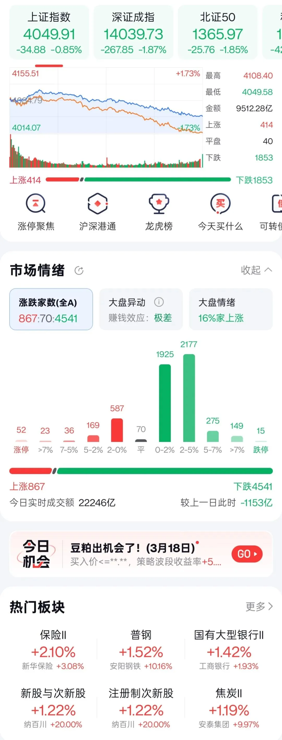 上海市调整商业用房购房贷款最低首付款比例政策,自3月16日起首付比例调整为不低于30%。受此消息提振,房地产板块(如中洲控股、京能置业)盘中冲高,成为今日为数不多的亮点之一。