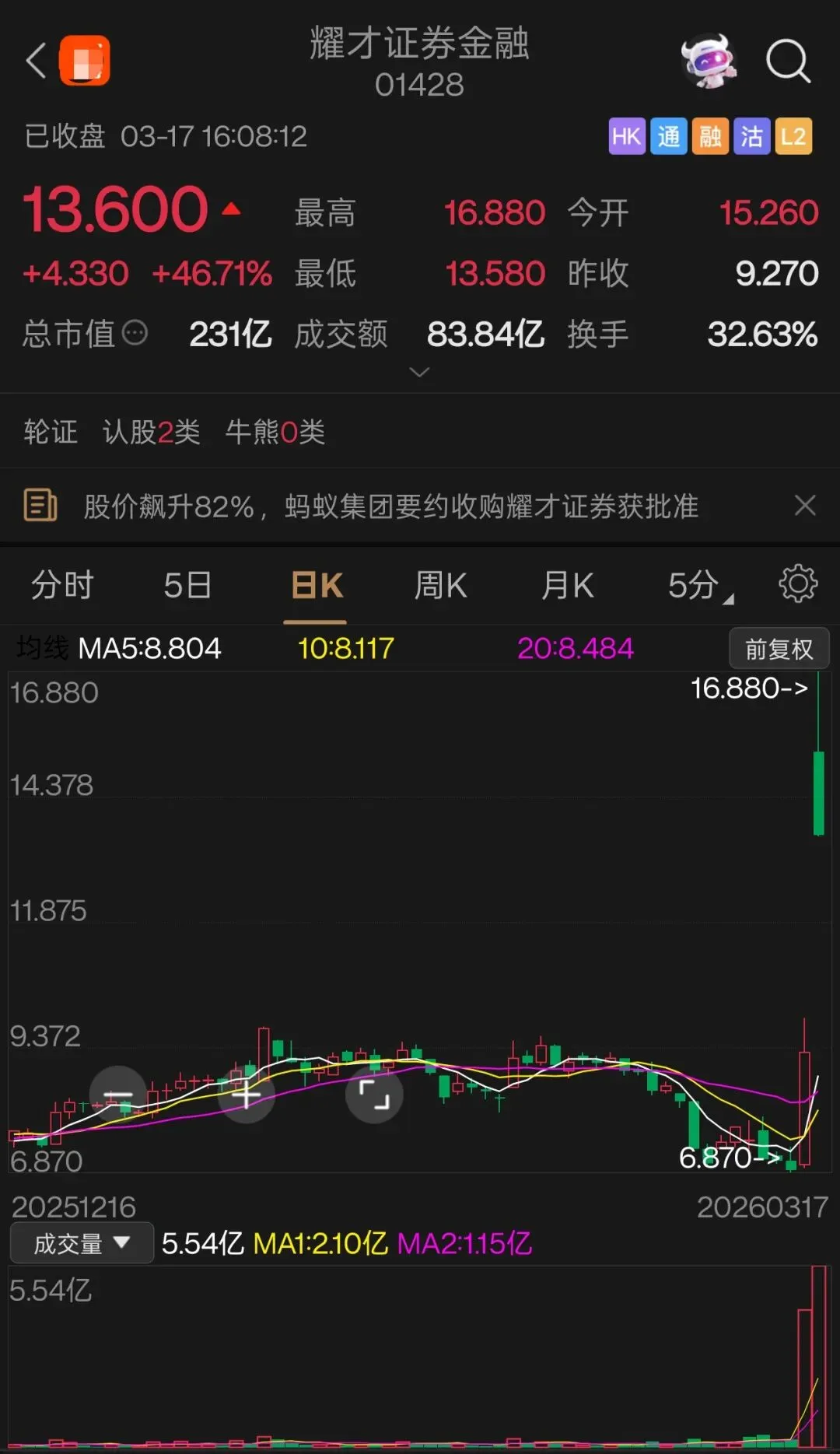 3. 蚂蚁集团收购获批:港股方面,蚂蚁集团对耀才证券金融的要约收购已通过审批,预计3月30日完成交割。受此影响,耀才证券金融复牌后一度飙涨超70%,带动相关概念股走强。A股证券板块今天终于在半死不活的沉默中,今天扑腾了一下.
