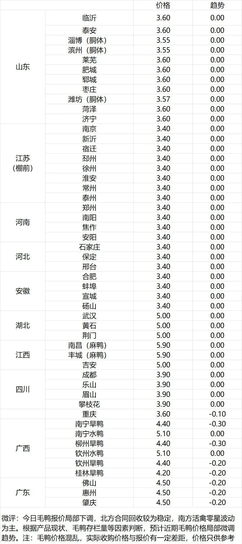 微评:鸭苗报价上涨。(注:南方只报当天价格)苗量少,计划紧张,养殖端成本高企,合同发放量控制。根据产品、养殖成本及鸭苗现状分析,预计近期鸭苗价格呈震荡偏强趋势。种蛋报价涨5分。温馨提示:该价格为主流厂家报价,实际销售价格以成交价格为准,价格仅供参考。