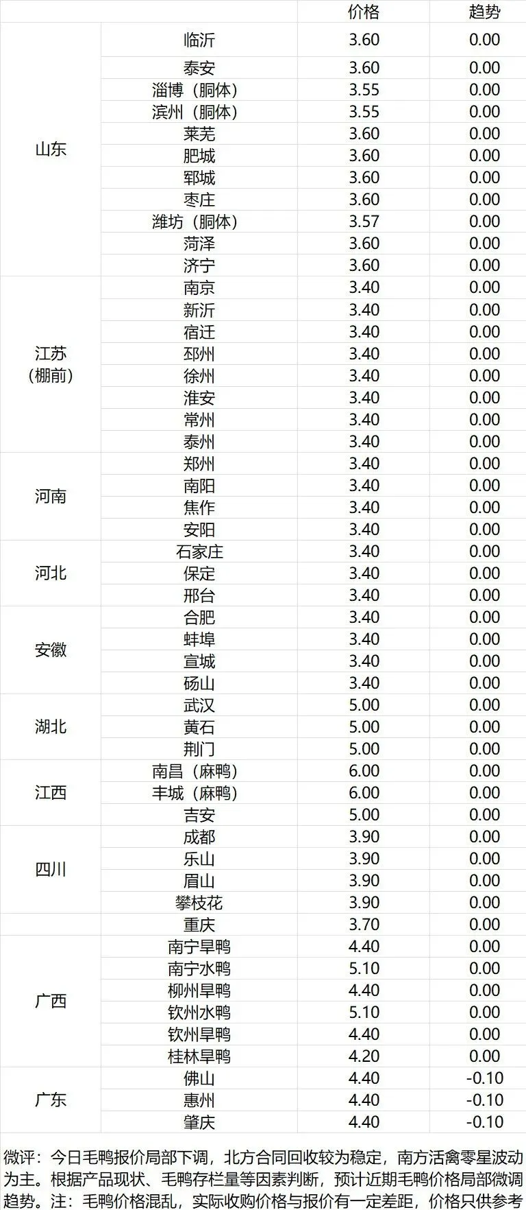 微评:鸭苗报价稳定。(注:南方只报当天价格)苗量少,计划紧张,养殖端成本高企,合同发放量控制。根据产品、养殖成本及鸭苗现状分析,预计近期鸭苗价格呈震荡偏强趋势。种蛋报价稳定。温馨提示:该价格为主流厂家报价,实际销售价格以成交价格为准,价格仅供参考。