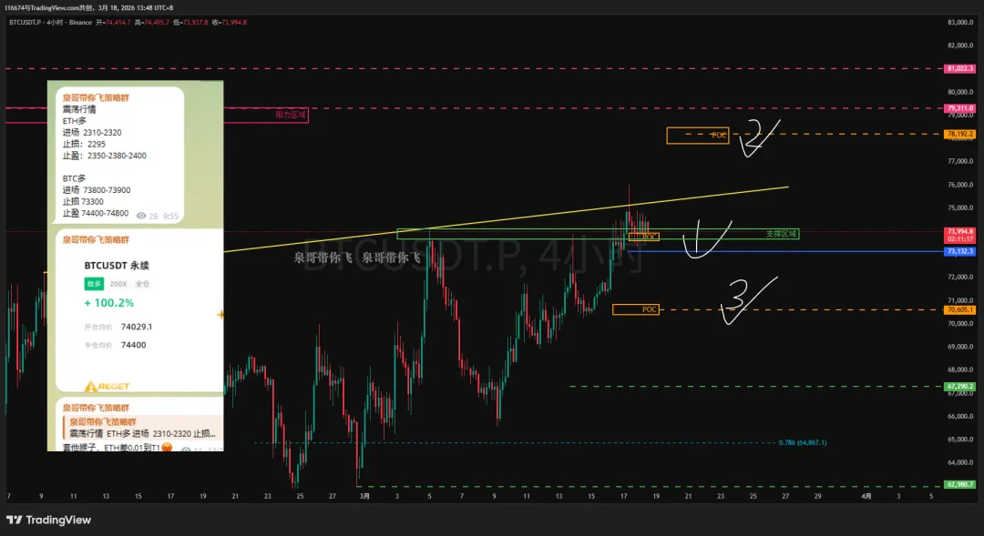 ETH的大时段支撑阻力依然相同,会持续关注后续更多的走势。持续盘整也是好事,形成形态再去操作。上午同样开了短多,但有点恶心,差0.01到T1止盈位,属实是不当人了。ETH 还是强势,我的多单还是拿着,暂时不做空。。