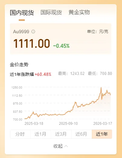 >今日金价行情(2026年3月18日14时)黄金AU9999微跌0.45%